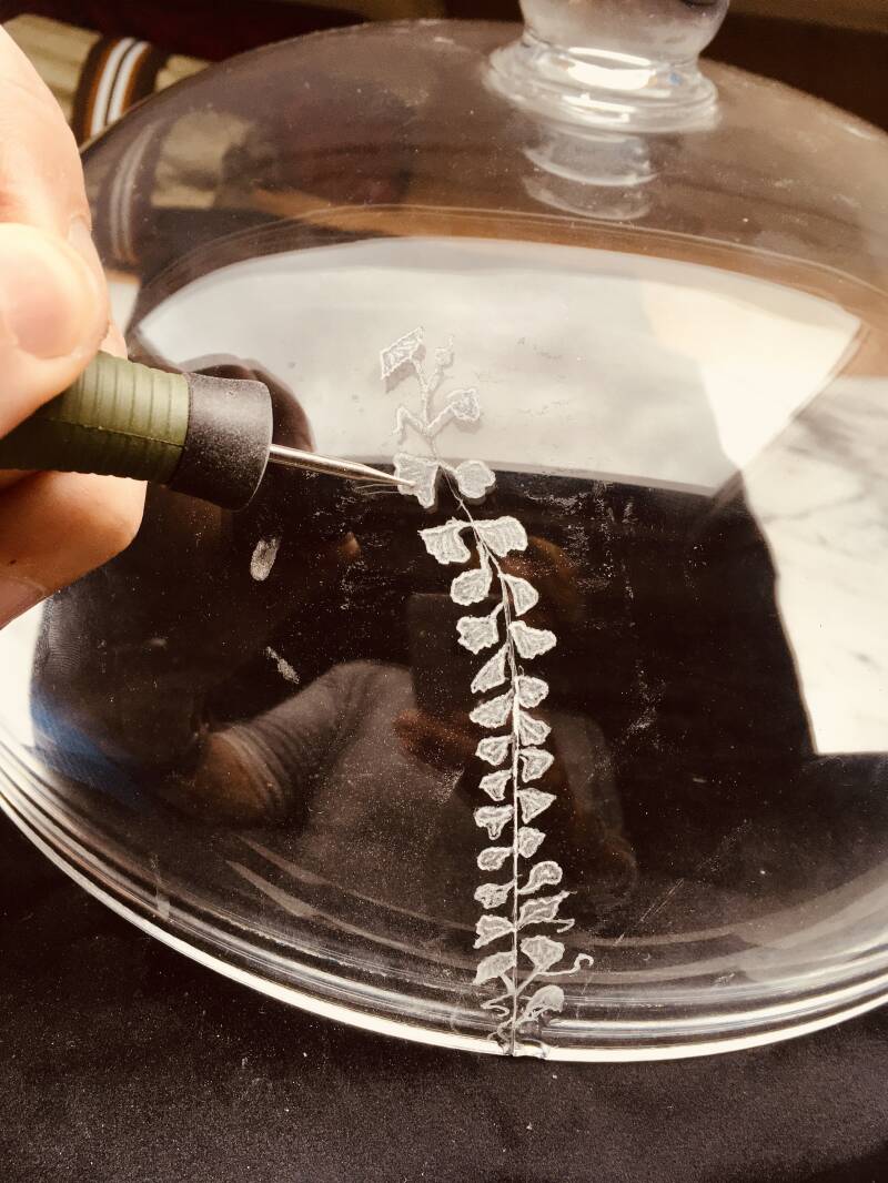 De techniek van graveren leent zich bij uitstek om materialen en producten te personaliseren. Dit doe ik met de multitool graveerset van Micromot. Dit kan bijvoorbeeld in glas, leer of metaal. Voor elk materiaal bijpassende frezen. In dit voorbeeld heb ik een scheur in de stolp omgezet in een tak met prachtige bladeren. Being damaged is part of the memory!